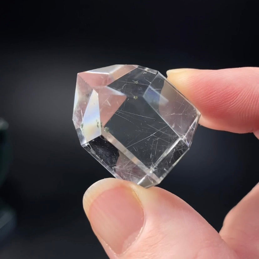 Clear polished quartz crystal with silver rutile inclusions. Size: 25 x 25 x 19 mm. 18 grams.