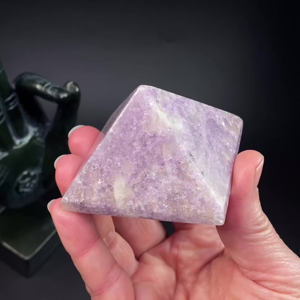 Lepidolite is often associated with calm, balance, and emotional grounding, making this pyramid a popular choice for meditation spaces, crystal grids, or as a soothing display piece. Each face reflects light differently, revealing the mineral’s depth and character from every angle.