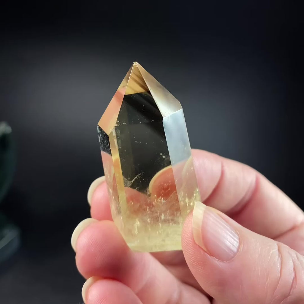 Polished yellow citrine crystal with smoky phantom-like whispy near the termination.