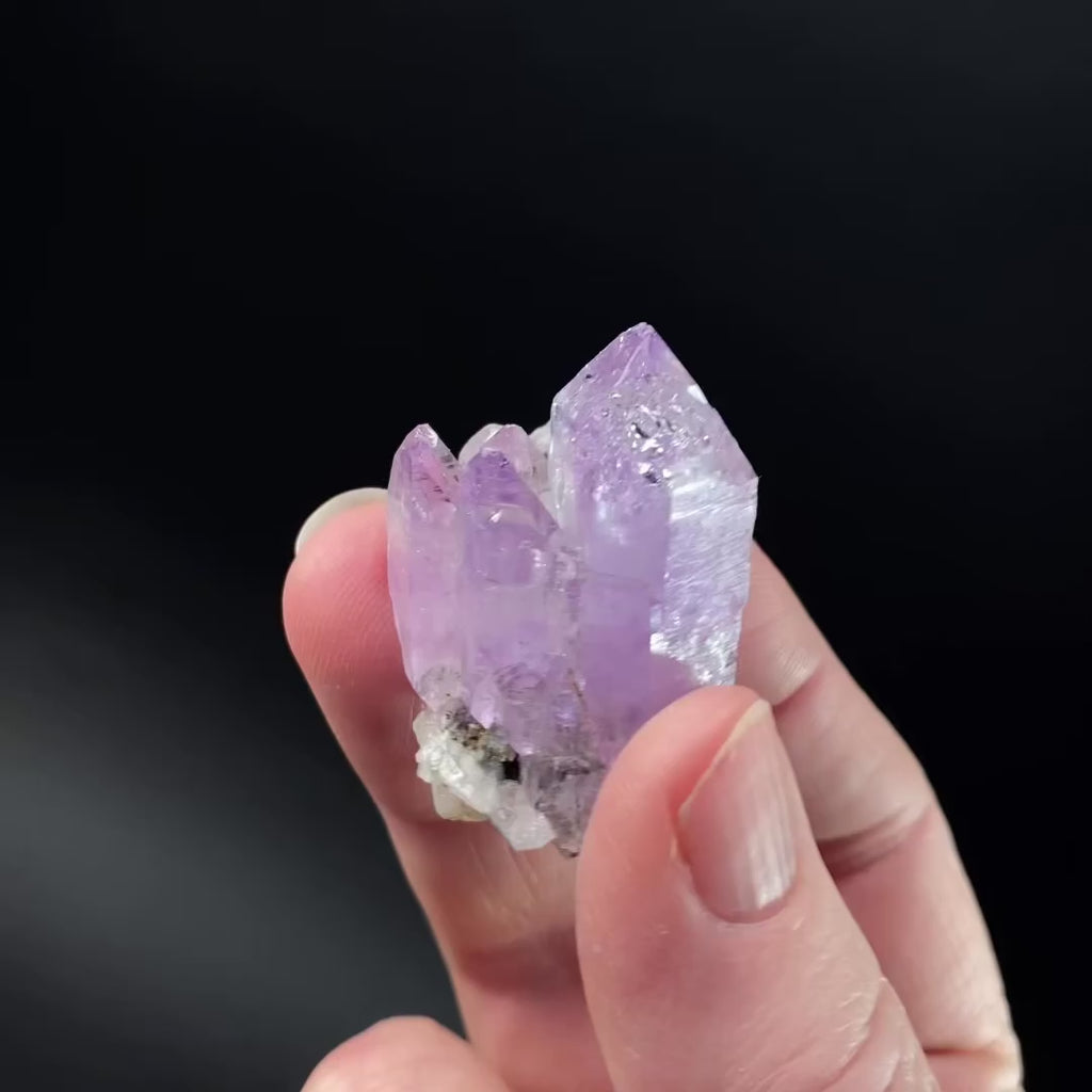 Lustrous purple amethyst crystal cluster. Some remnant matrix mineral on base of cluster.