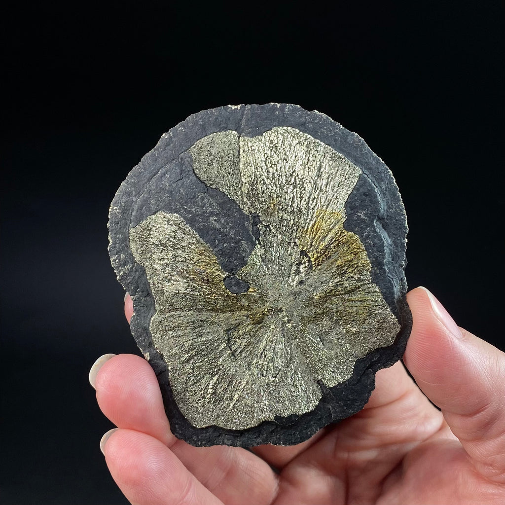Sometimes called Pyrite Suns, Pyrite Dollars, Miner’s Dollars, or Sun Dollars. The crystal structures formed deep underground under great pressure about 350 million years ago. These round disks sometimes occur between seams of coal and may be found when coal is mined. Although pyrite is quite common worldwide, the disk form is virtually unique to Illinois.