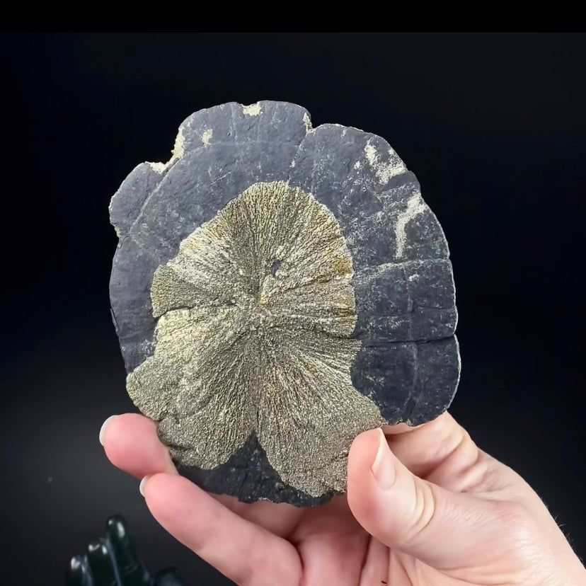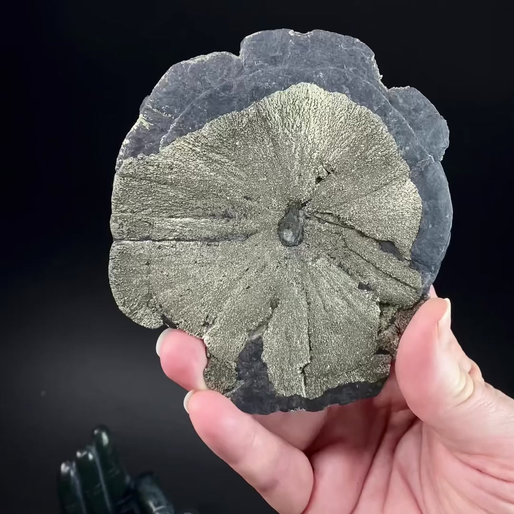 This is a unique pyrite sun dollar from Sparta, Illinois. The outer ring is a charcoal gray which contrasts beautifully with the golden hue of the pyrite.