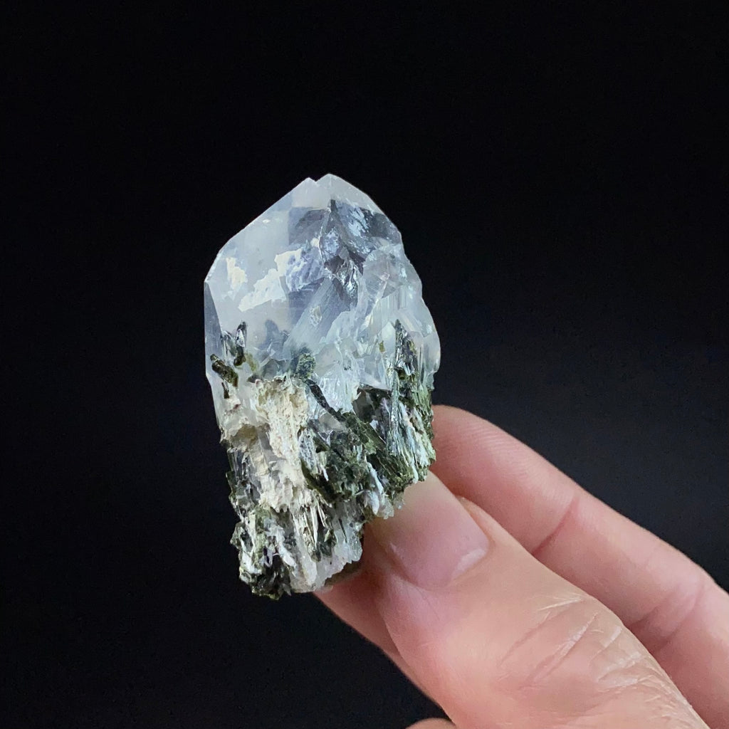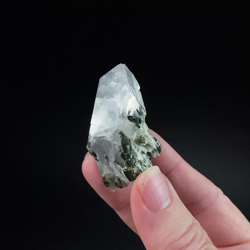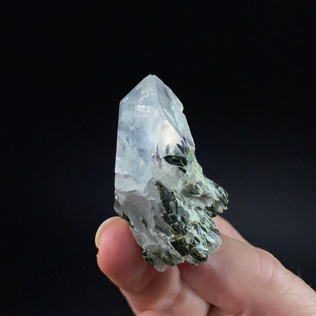 Clear quartz crystal with dark green epidote crystals near the base of the crystal. There is a termination is split at the very top. Location: Balochistan, PakistanSize: 49 x 26 x 26 mm. 28 grams