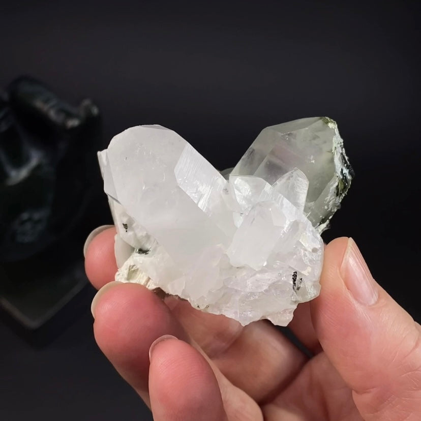 Nice quartz crystals with white and green byssolite inclusions and epidote crystals, a few included, and near the base.Location: Balochistan, PakistanSize: 52 x 45 x 42 mm. 86 grams
