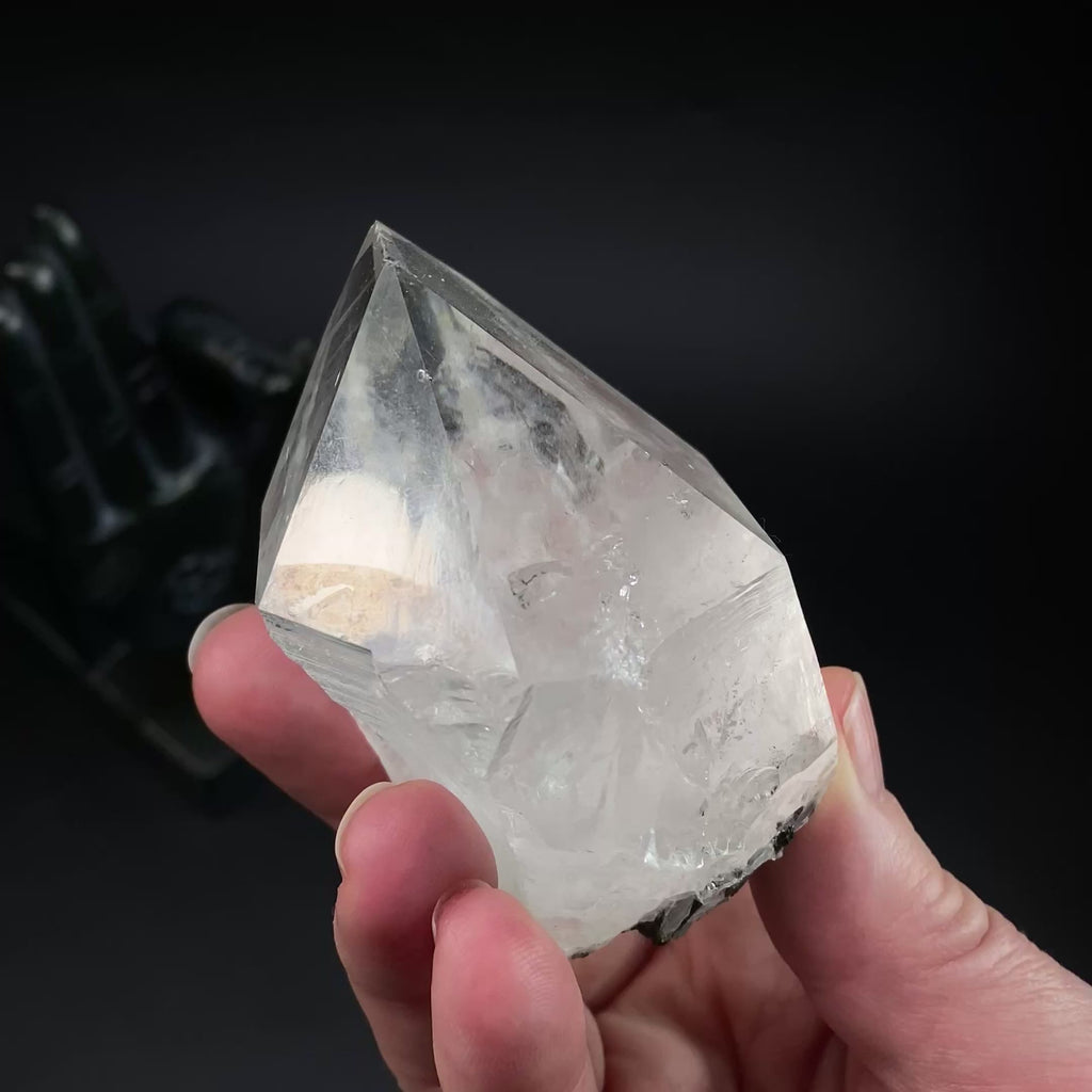Clear quartz crystal with dark green epidote crystals near the base of the crystal and several intricate crystal imprints. Location: Balochistan, PakistanSize: 75 x 57 x 45 mm. 230 grams