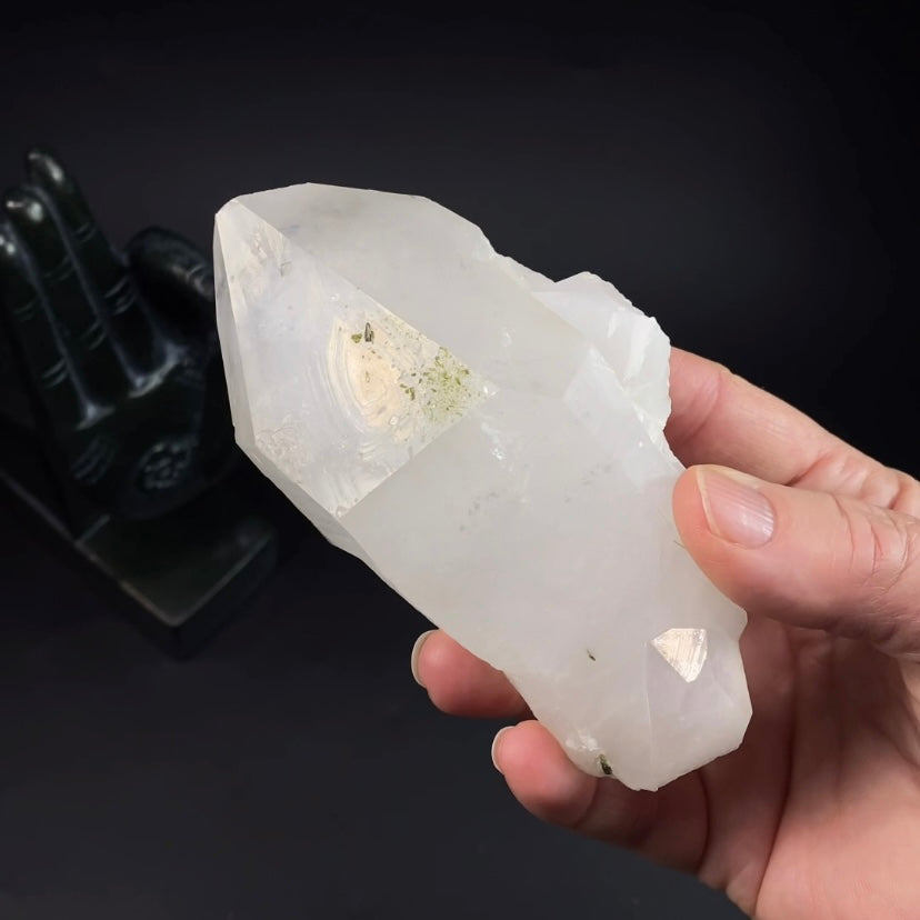 Clear quartz crystal with dark green epidote crystals. Minor byssolite inclusions in the quartz. Location: Balochistan, PakistanSize: 112 x 65 x 50 mm. 278 grams
