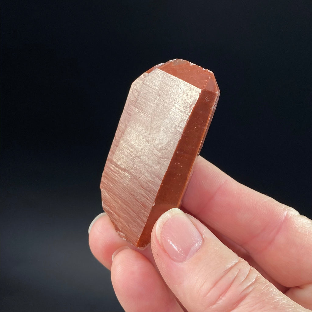 Beautiful red hematite included tabular quartz crystal. There are some small chips at the termination.