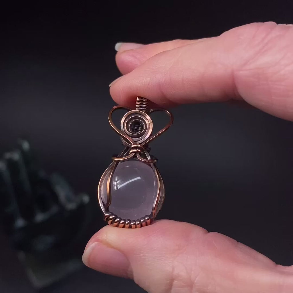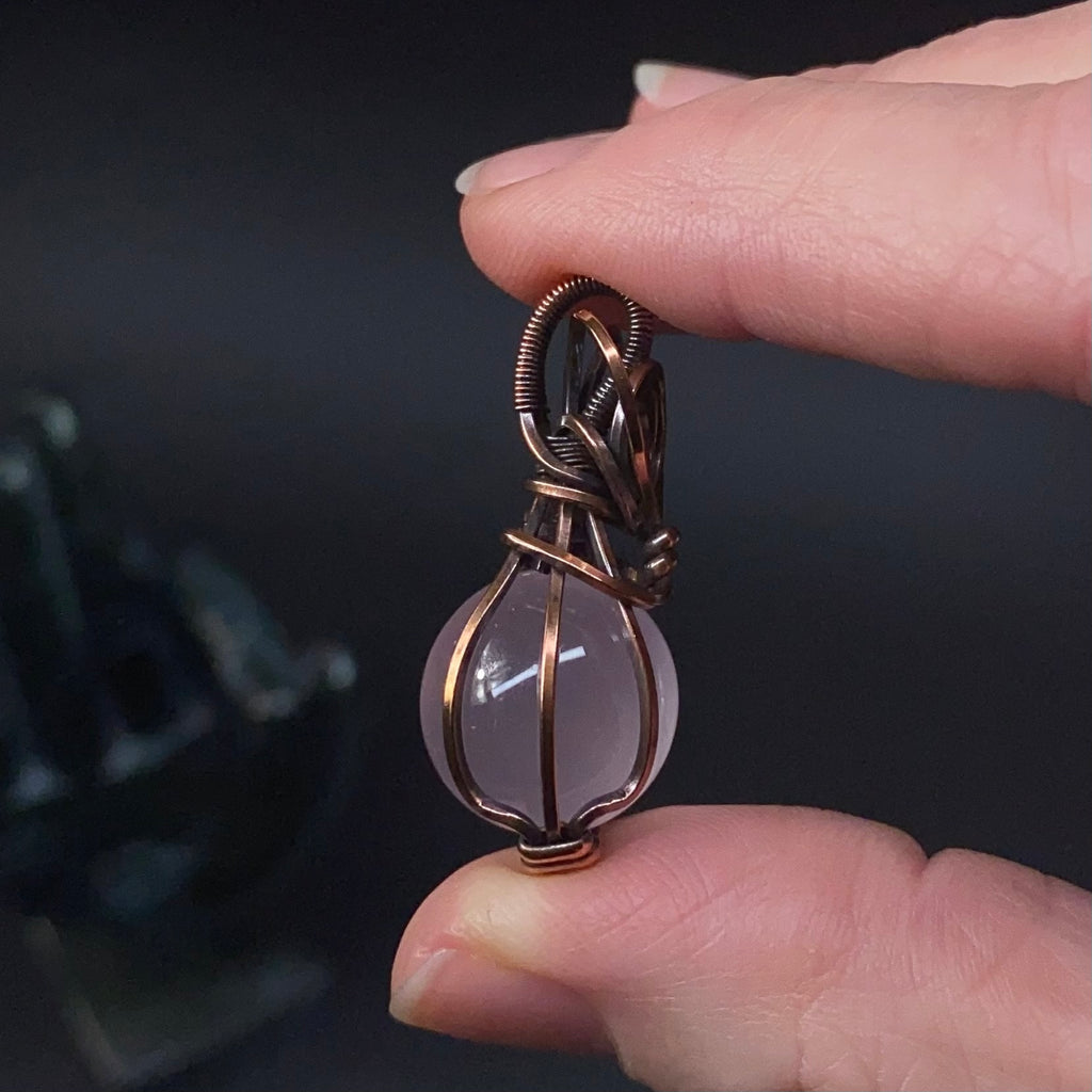 Light pink rose quartz sphere wrapped in copper wire that has been oxidized and polished.