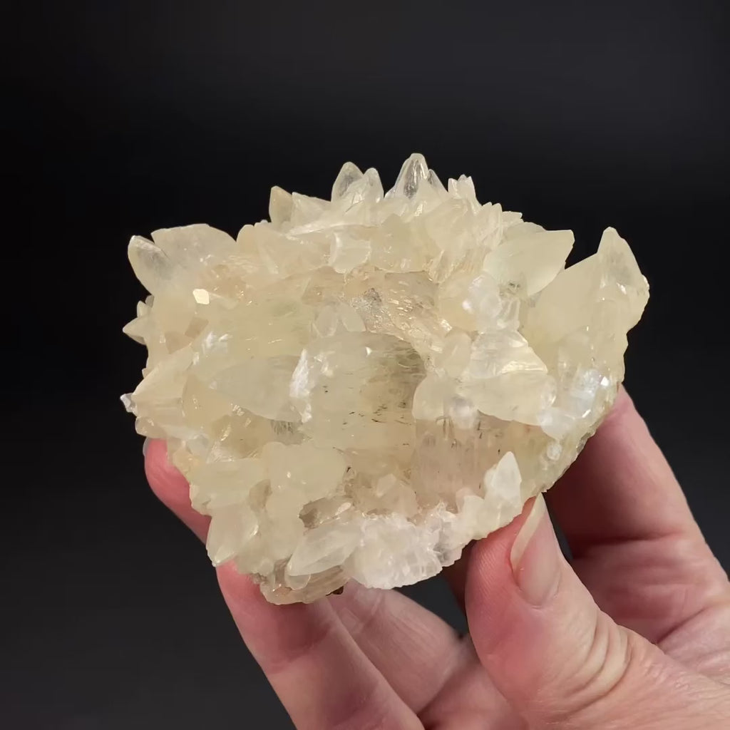 White/Clear and translucent scalenohedral / dog tooth calcite crystals sit atop blue / purple fluorite matrix. The calcite fluoresces a light orange and the fluorite a deep blue under long wave UV light.