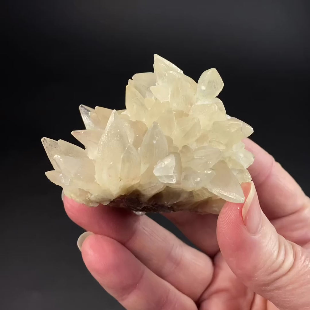 Clear yellow and translucent scalenohedral / dog tooth calcite crystals sit atop blue / purple fluorite matrix. The calcite fluoresces a light orange and the fluorite a deep blue under long wave UV light.