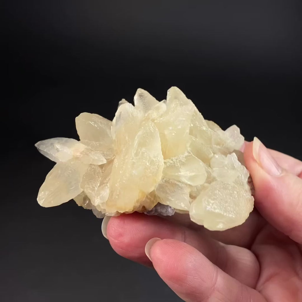 Yellow / clear and translucent scalenohedral / dog tooth calcite crystals sit atop blue / purple fluorite matrix. The calcite fluoresces a light orange and the fluorite a deep blue under long wave UV light.