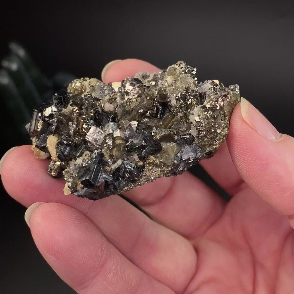 This is a natural crystal cluster with sphalerite, pyrite and a minor amount of calcite. This piece is from the famous Trepça Mine complex in the Trepça Valley in Kosovo.