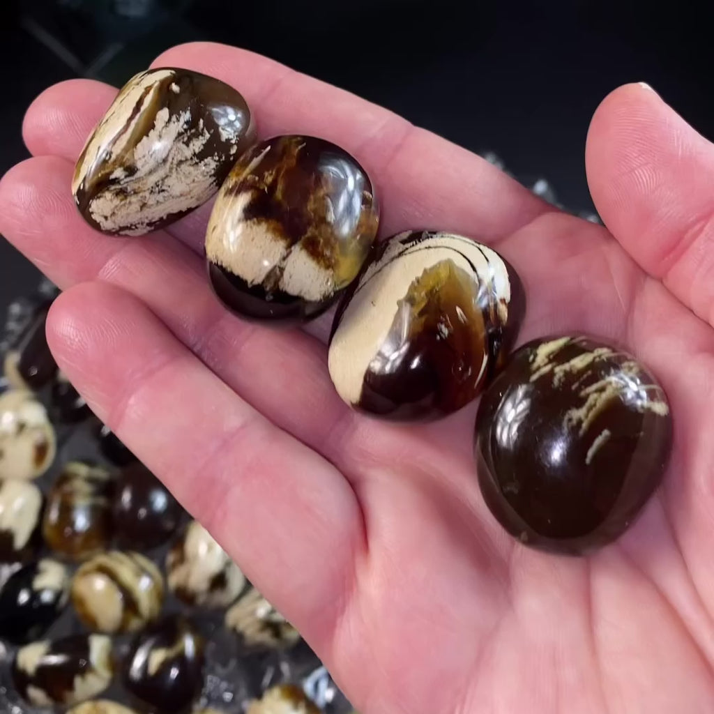 These beautiful polished pieces come from the Jambi/Sarolangun region of Sumatra, one of the world’s most famous sources of richly patterned fossil amber. The striking contrast between deep coffee-brown areas and lighter caramel-to-cream swirls is completely natural and formed millions of years ago.