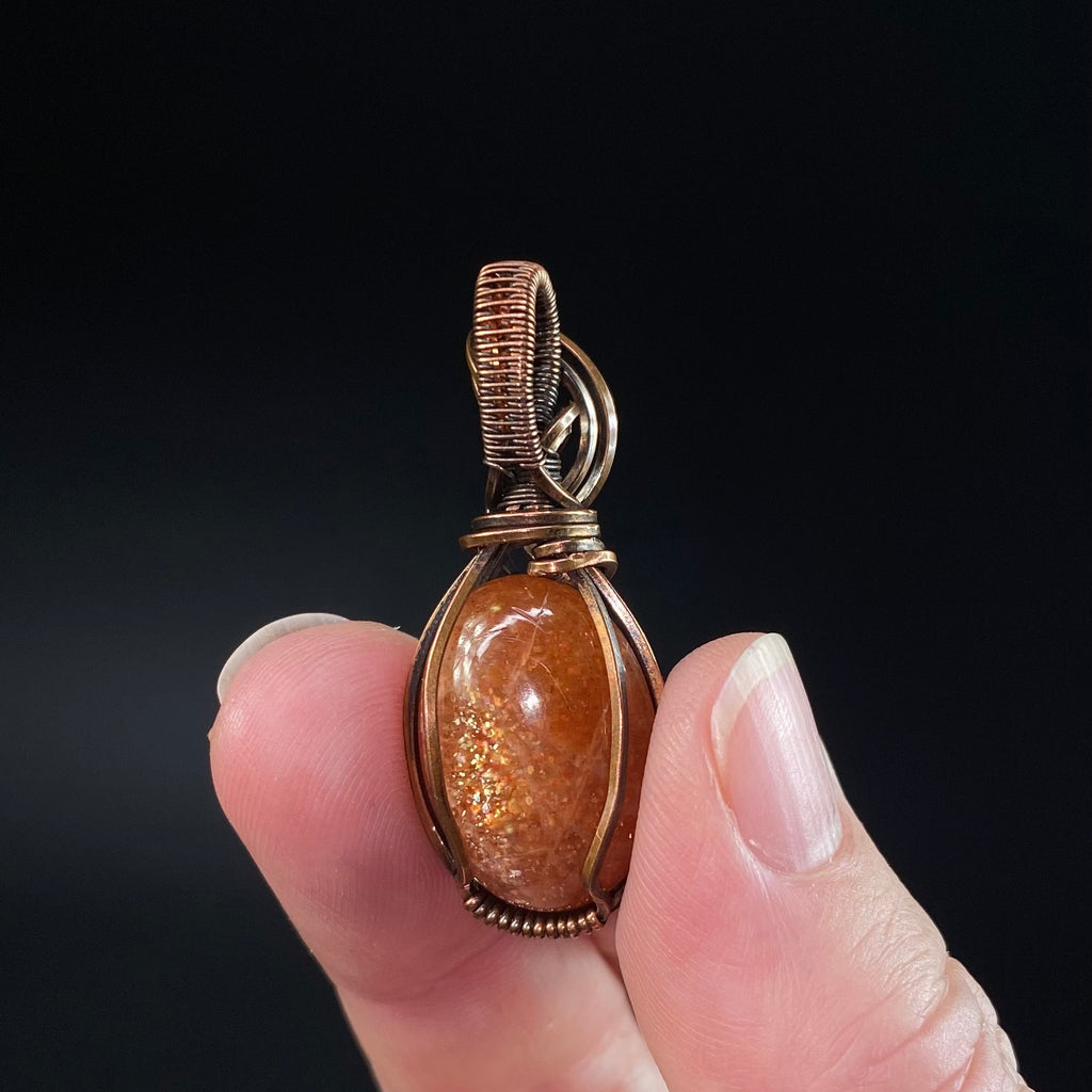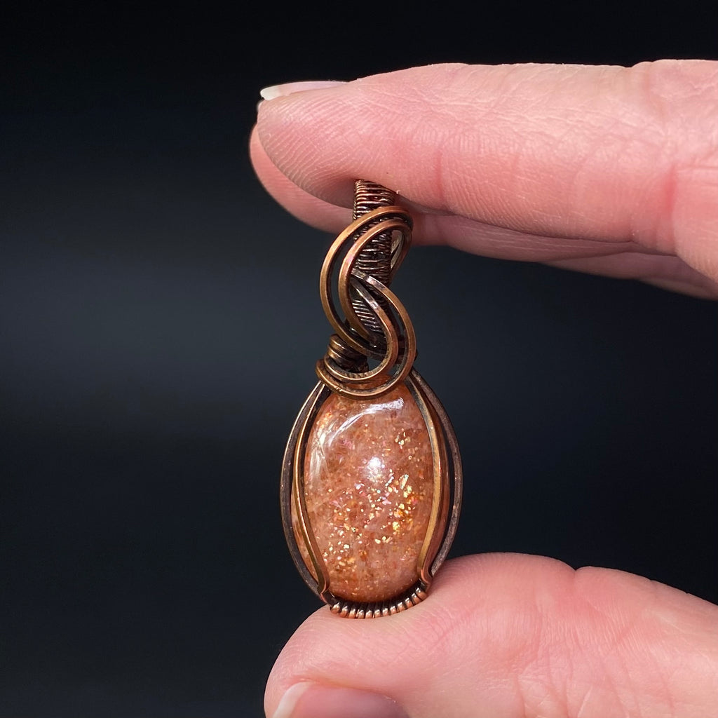 Gorgeous sunstone wrapped in oxidized copper wire.