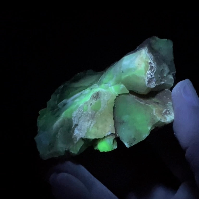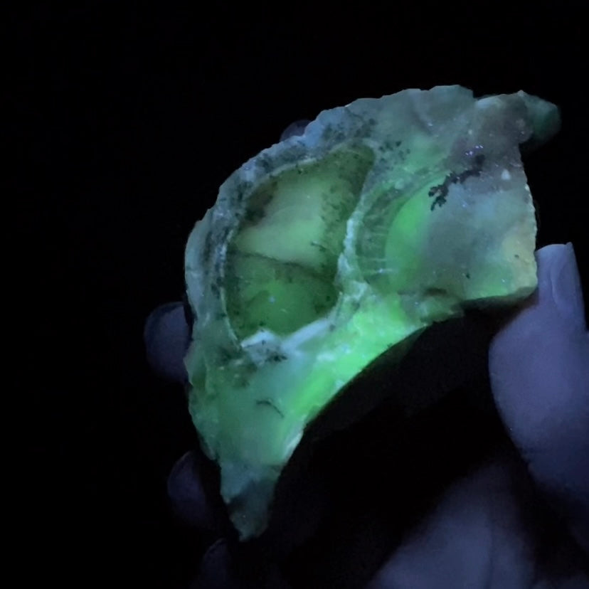 The piece is UV reactive and fluoresces shades of white and light colors with long wave UV light source (365 nm) and a beautiful green with 254nm short wave UV.