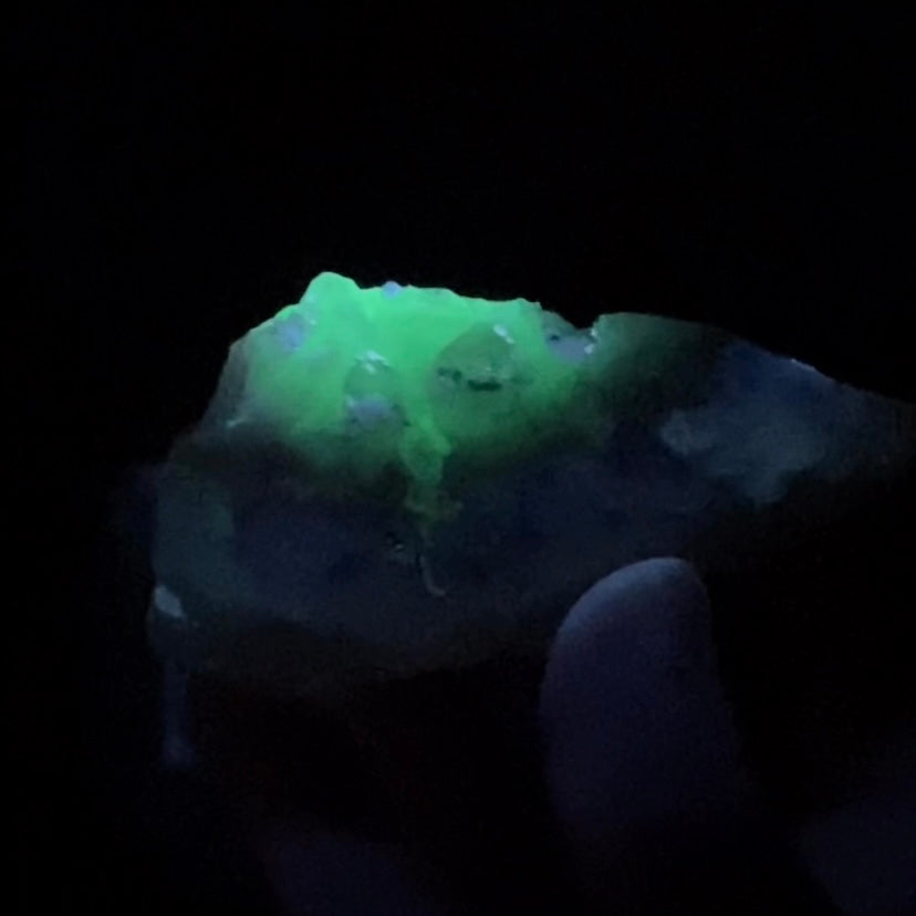 The piece is UV reactive and fluoresces shades of white and light colors with long wave UV light source (365 nm) and a beautiful green in limited areas with 254nm short wave UV.