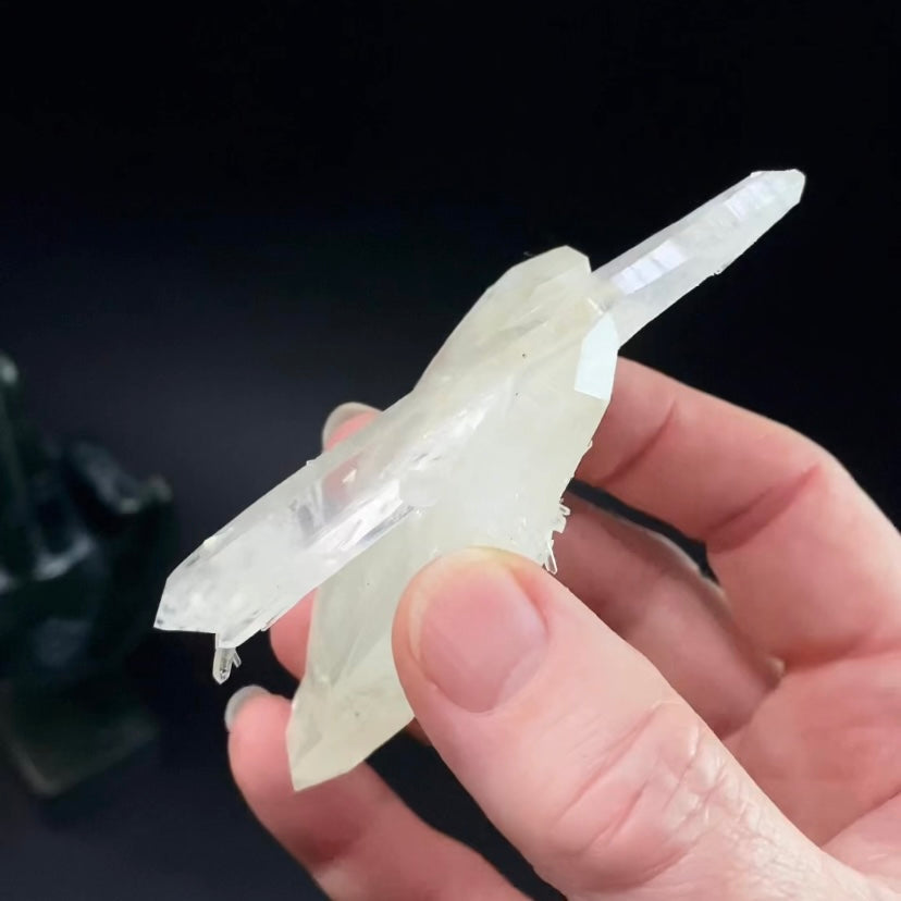 Unique Himalayan quartz cluster with two inter-grown crystals. One crystal is a tabular (flat) crystal with micro quartz crystals on one side, the other crystal is a double terminated laser crystal with a few micro crystals on one end.