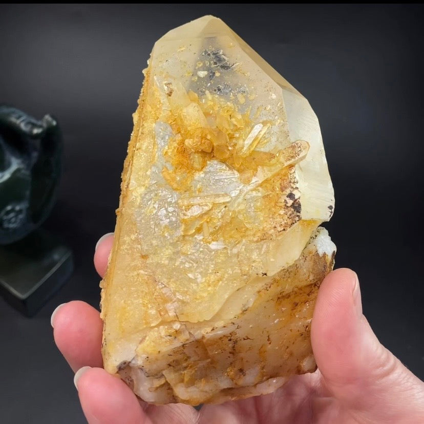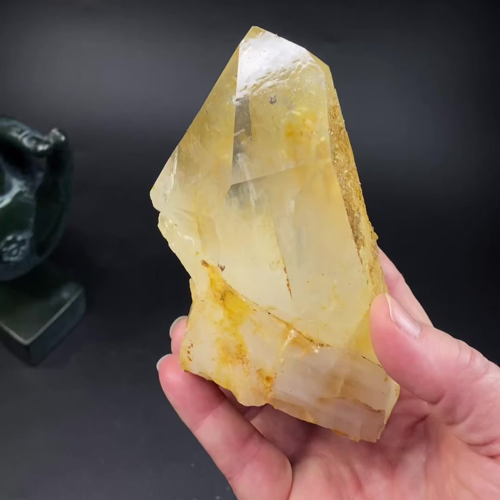 Beautiful, and extra large, golden quartz crystal with a natural yellow iron oxide coating. There is an imprint from where another crystal was in contact with this crystal. That imprint has beautiful stepped (self-healed) patterns.