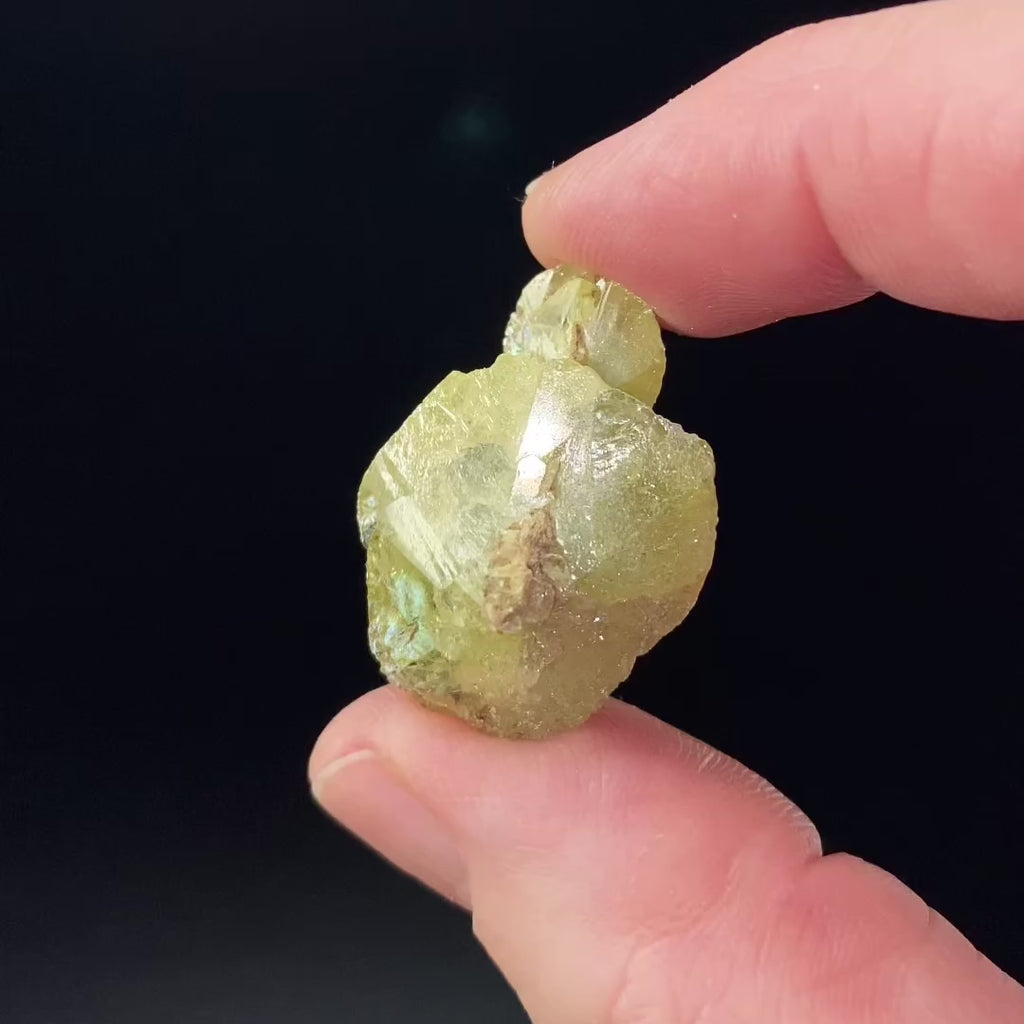 This titanite displays a distinctive flattened, disc-like crystal habit, a form that is far less common than the typical wedge or bladed crystals seen for the species. The crystal shows a soft yellow to yellow-green coloration, with a semi-translucent body and bright, reflective crystal faces that catch the light beautifully. Subtle growth zoning and natural surface textures are visible, adding depth and character to the piece. Minor matrix remnants remain along the crystal edges, emphasizing its natural, unaltered condition.