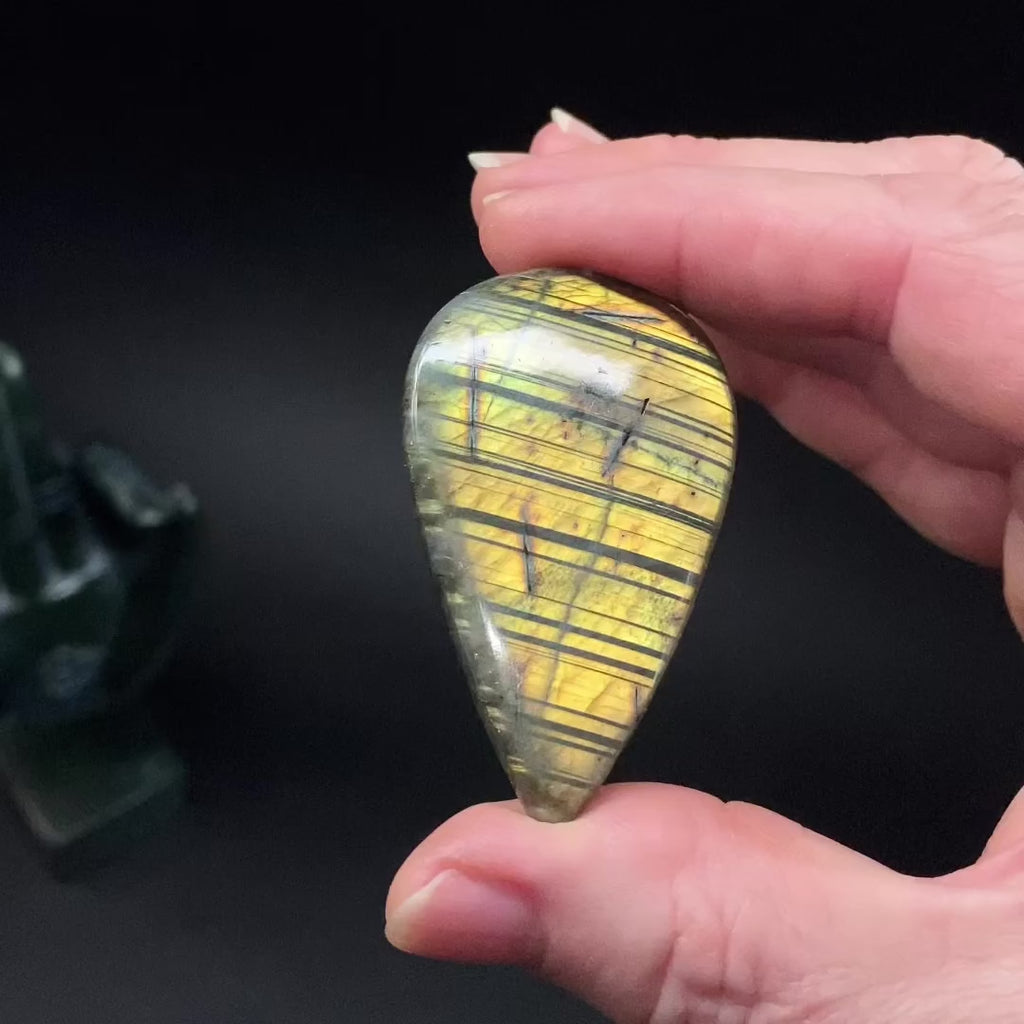 Beautiful teardrop shaped labradorite cabochon with excellent orange yellow flash.