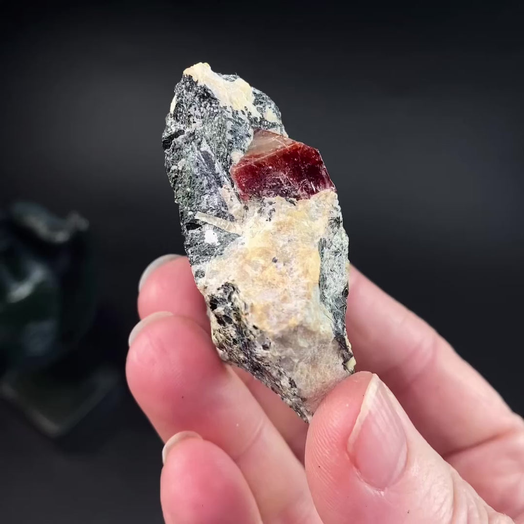The apatite fluoresces yellow/orange with 254nm short wave UV light. The calcite in the biotite-calcite matrix fluoresces pink under 254nm short wave UV. PLEASE NOTE: This specimen only fluoresces with 254nm, short wave ultraviolet light. A filtered, high-quality lamp is ESSENTIAL.
