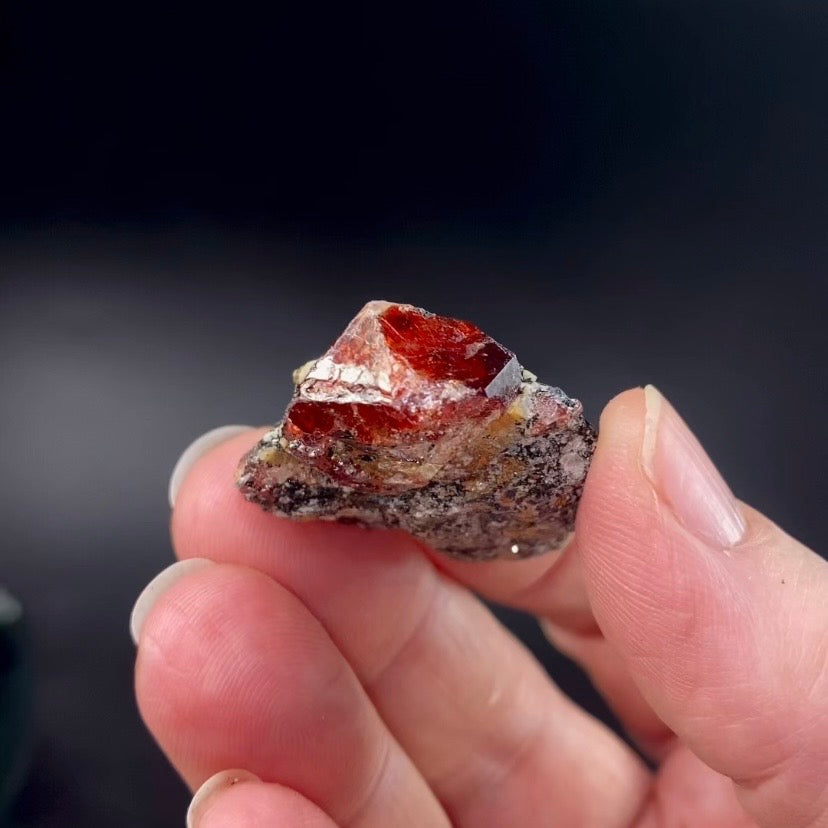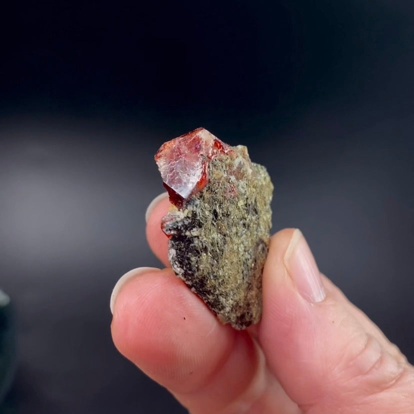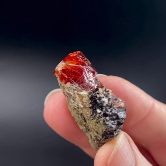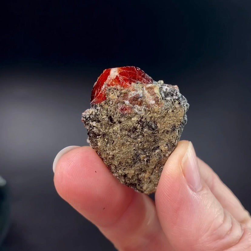 Beautiful red zircon crystal, with fluorescent apatite inclusions in biotite-calcite schistose matrix.